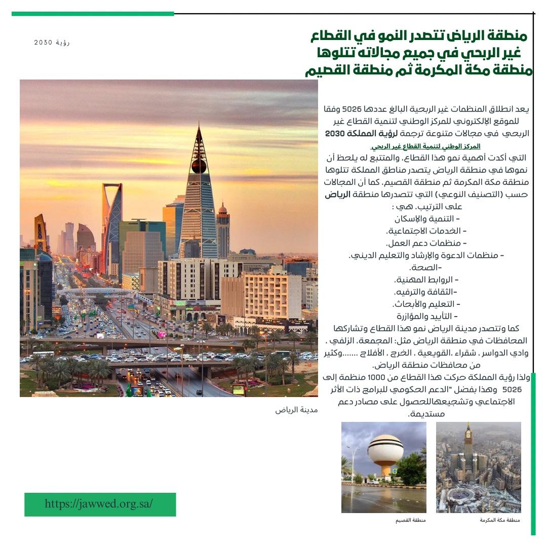 منطقة الرياض تتصدر النمو في القطاع غير الربحي في جميع مجالاته تتلوها منطقة مكة المكرمة ثم منطقة القصيم
