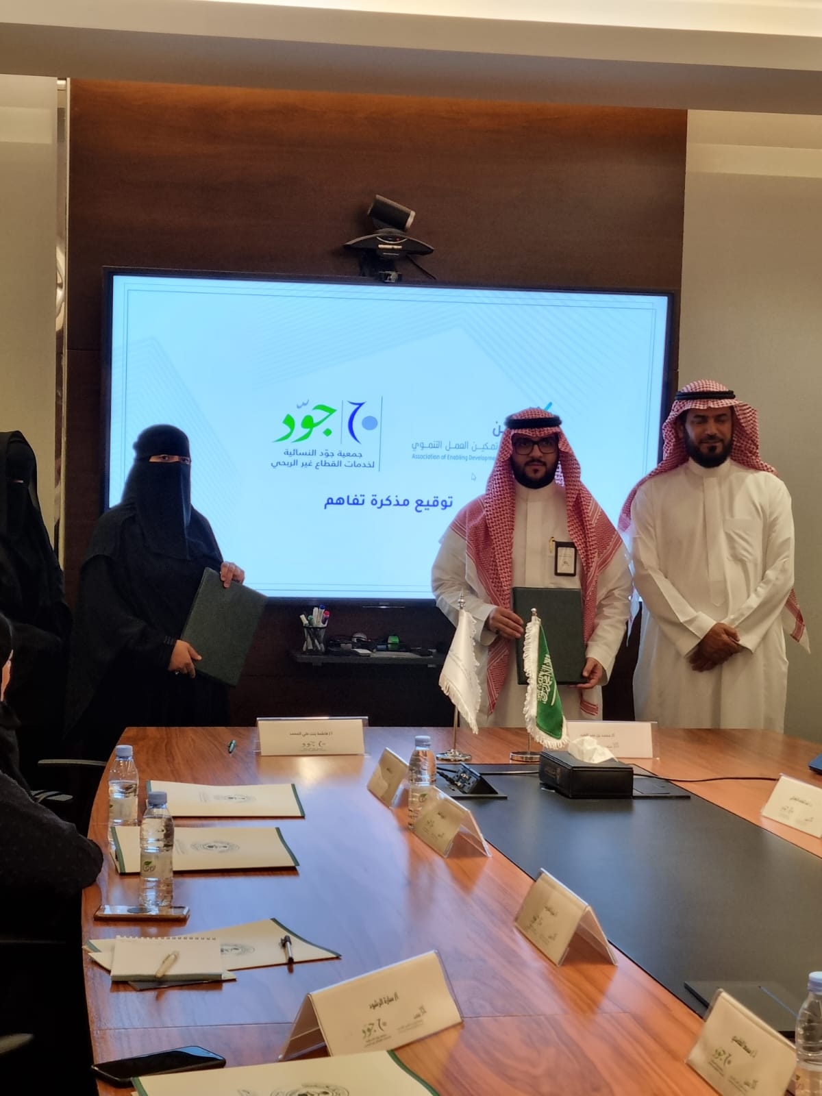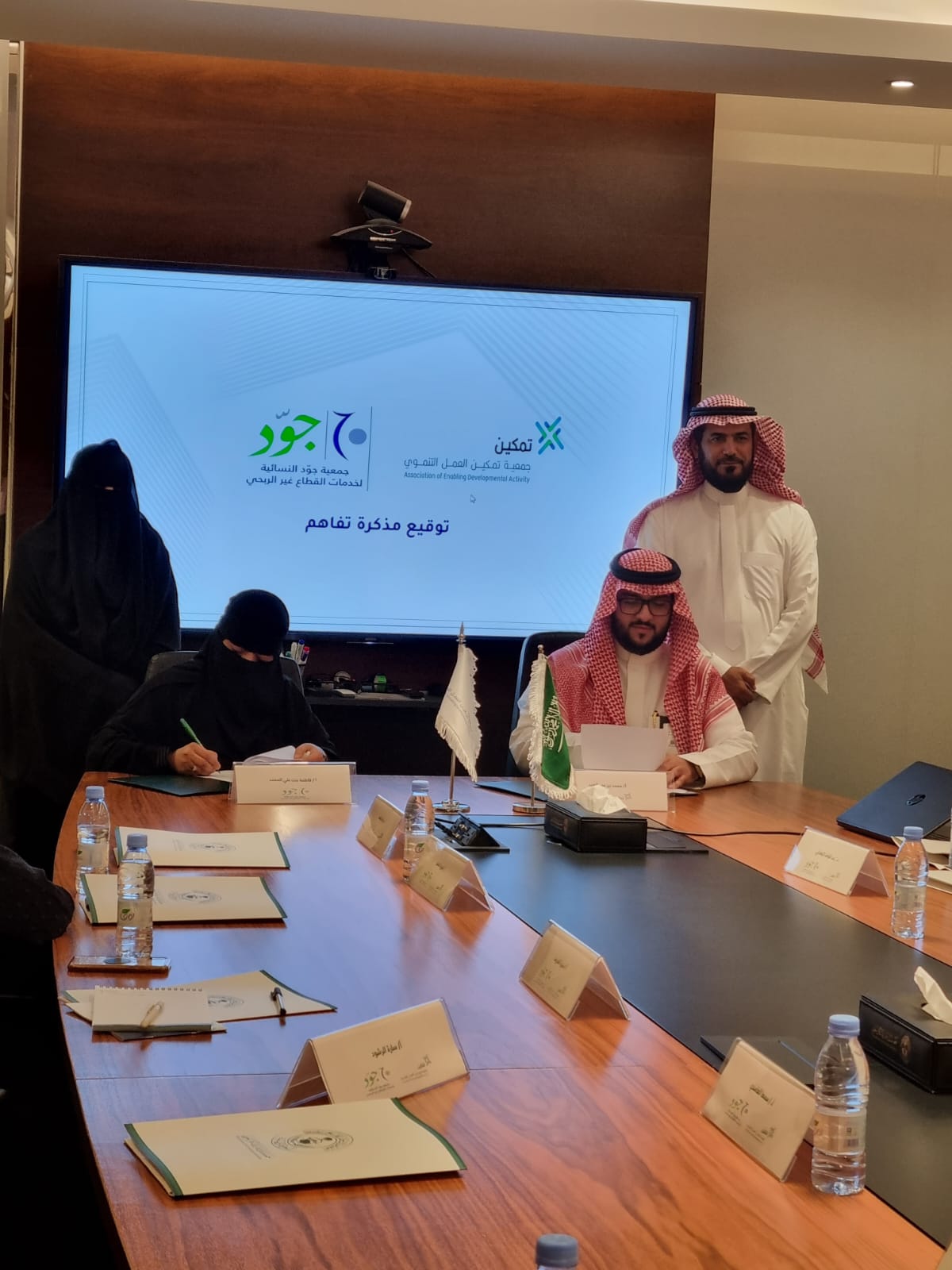 وقعت جمعية جوّد مذكرة تفاهم مع جمعية تمكين بحضور المدير التنفيذي الاستاذه فاطمة بنت علي المحمد من جمعية جوّد النسائية و الاستاذ محمد بن عمر العيد من جمعية تمكين العمل التنموي